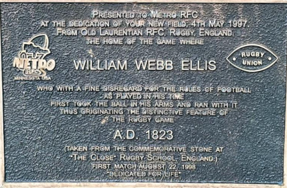 Taken from the commemorative stone at "The Close" in Rugby England. The rock has been a part of Columbia Park since it was presented to us by our friends The Old Laurentian RFC as a dedication to our new field in 1997. Since then, it has been a source of good luck for any player who touches it before taking the field.